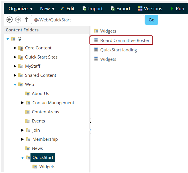 - Navigate through the following folder path: @/Web/QuickStart/Board Committee Roster