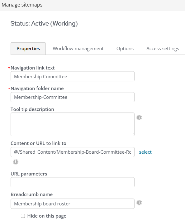 - (optional) Breadcrumb name - The name that appears in the breadcrumb menu on the public site.