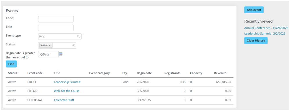 - Recent History to show events that have been recently viewed by the user.