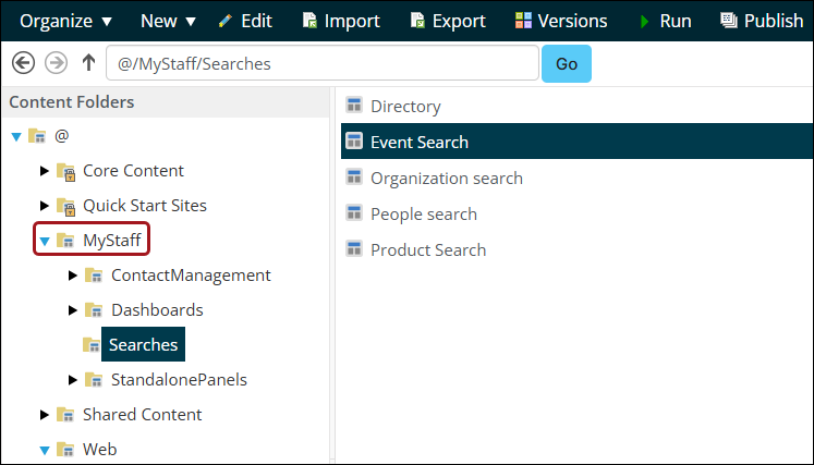The Event Search contact record is found by going to RiSE > Page Builder > Manage content > MyStaff > Searches > Event Search.