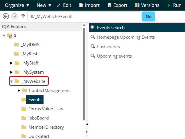 - Query Menu to display the query: $/_MyWebsite/Events/Events search.