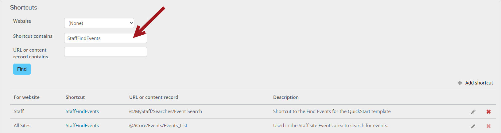 The Find Events site navigation item uses a custom shortcut for the Staff site called StaffFindEvents and points to the page: @/MyStaff/Searches/Event Search. Go to Site Builder > Manage shortcuts and search for StaffFindEvents.