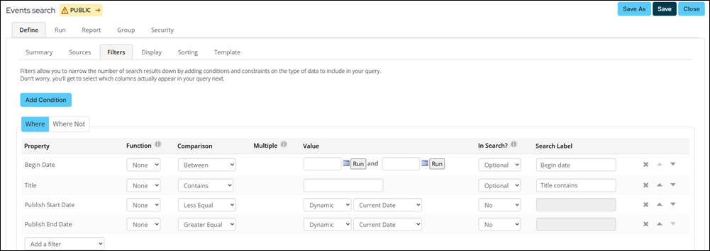 - Modify search fields - Update the filters on the Filters tab in the query to change the search fields displayed.