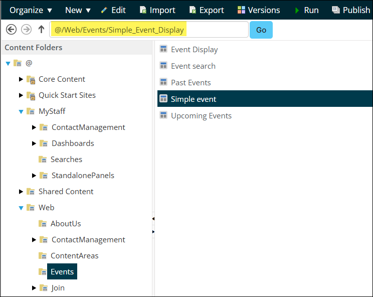 The public website called Web includes copies of the out-of-the-box Event Display and Simple Event content records for configuration if required. The following content records can be configured by going to: RiSE > Page Builder > Manage content.