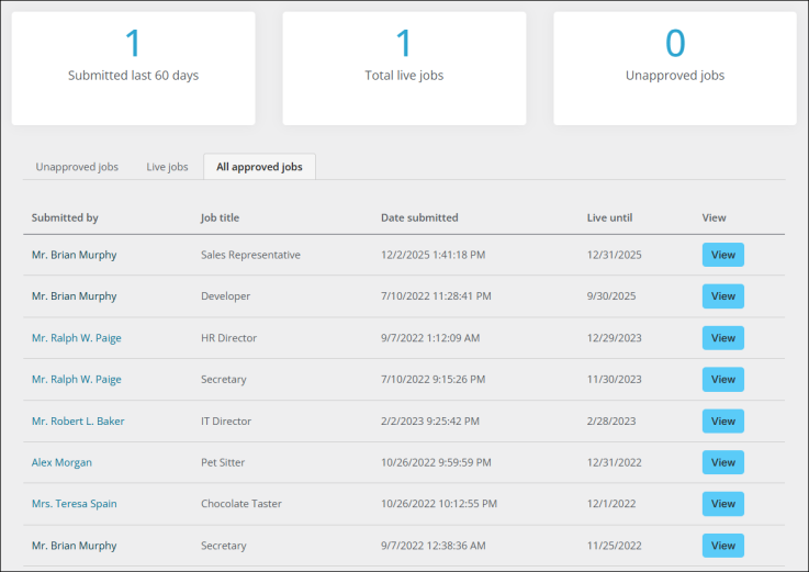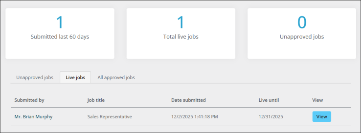 Once approved, the listing can be viewed and edited from either the Live jobs or All approved jobs tab.