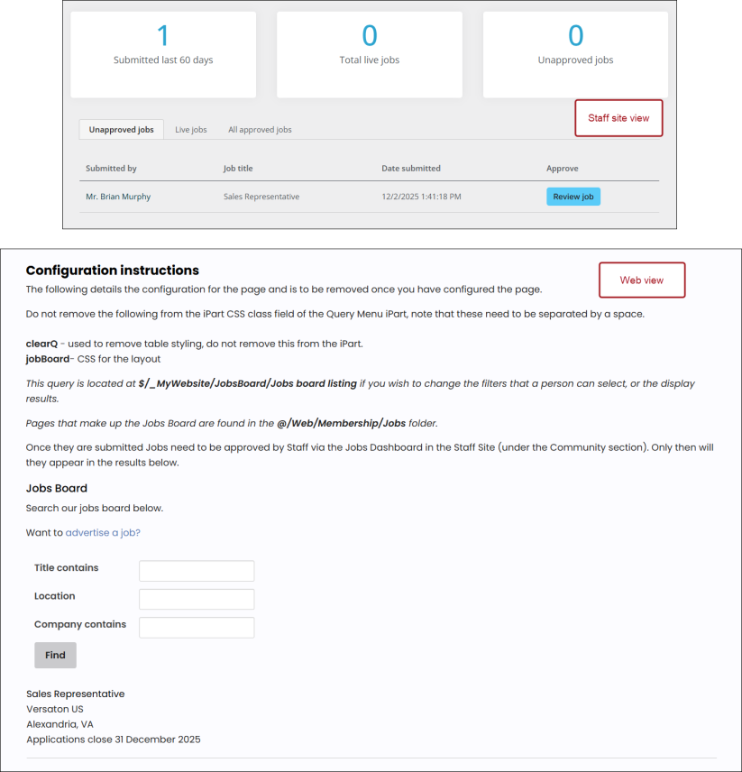 The Jobs Board feature allows your members or the public to submit job listings for inclusion on your website. The Staff site dashboard is where staff can manage and approve any submissions.