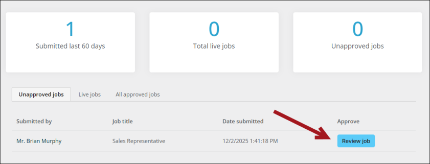 - From the Unapproved jobs tab, click Review job in the Approve column of the submitted listing.