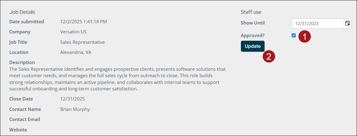 - Staff - Job approval – Used by staff to approve a job listing and set the date it will display until.