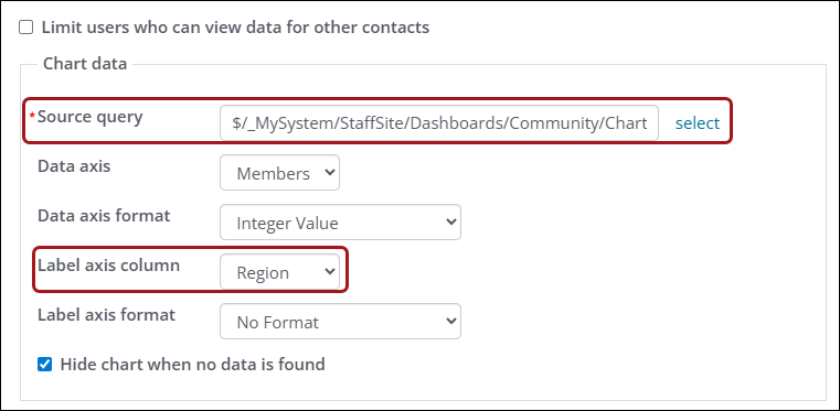 - Under Chart data, select the query for the region you would like to display and update the Label axis column property for the region you are displaying.