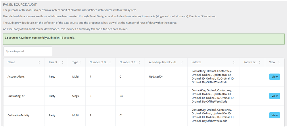 The audit provides details on the definition of the panel sources and the properties it has, as well as the number of rows of data within the source. An Excel copy of this audit can be downloaded, which includes a summary tab and a tab per panel source.