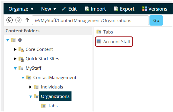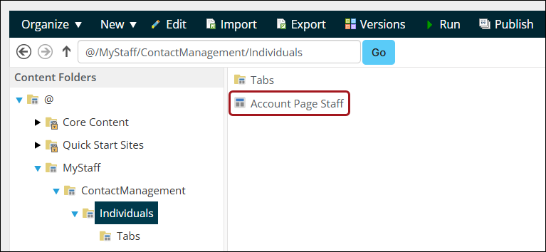 - The Staff site Account Page Staff content record is located at @/MyStaff/ContactManagement/Individuals.