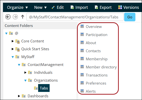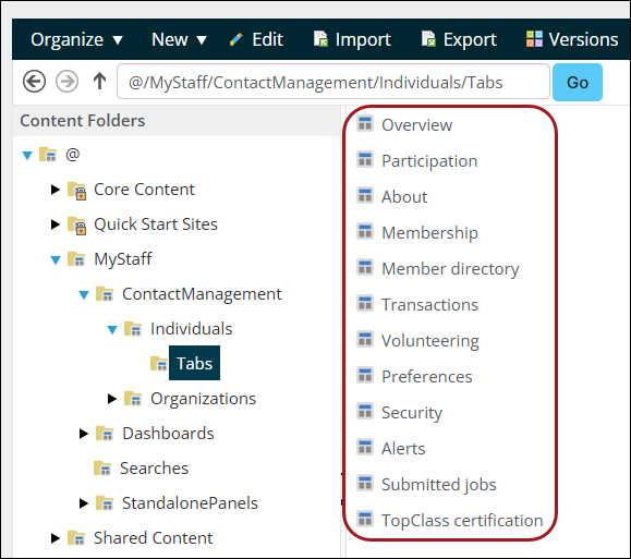 - The content records for the Staff site account page's tabs are located in @/MyStaff/ContactManagement/Individuals/Tabs.
