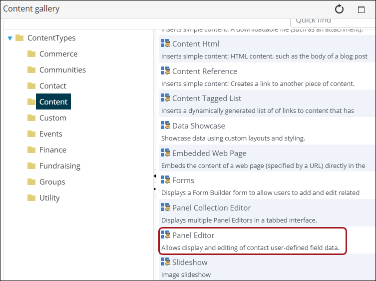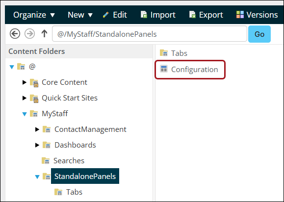 Note: Alternatively, edit the Standalone panel configuration page from RiSE > Page Builder > Manage content. Navigate through the following folder path: @MyStaff/Standalone Panels. Then select the Configuration content record. A staff user can edit the Standalone panel configuration page by opening the Configuration content record in Page Builder. The Configuration content record is located at @/MyStaff/Standalone Panels.