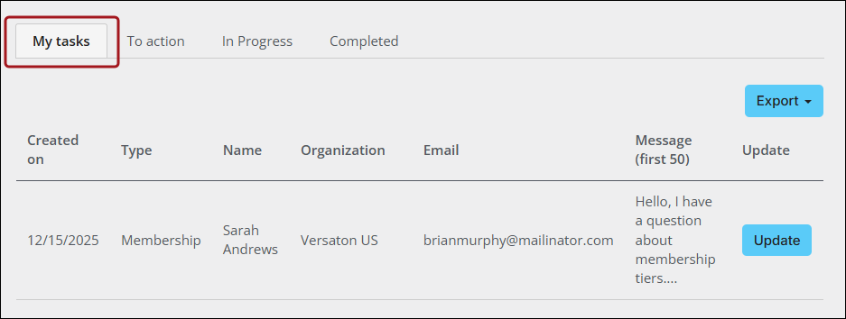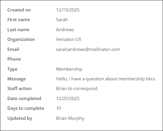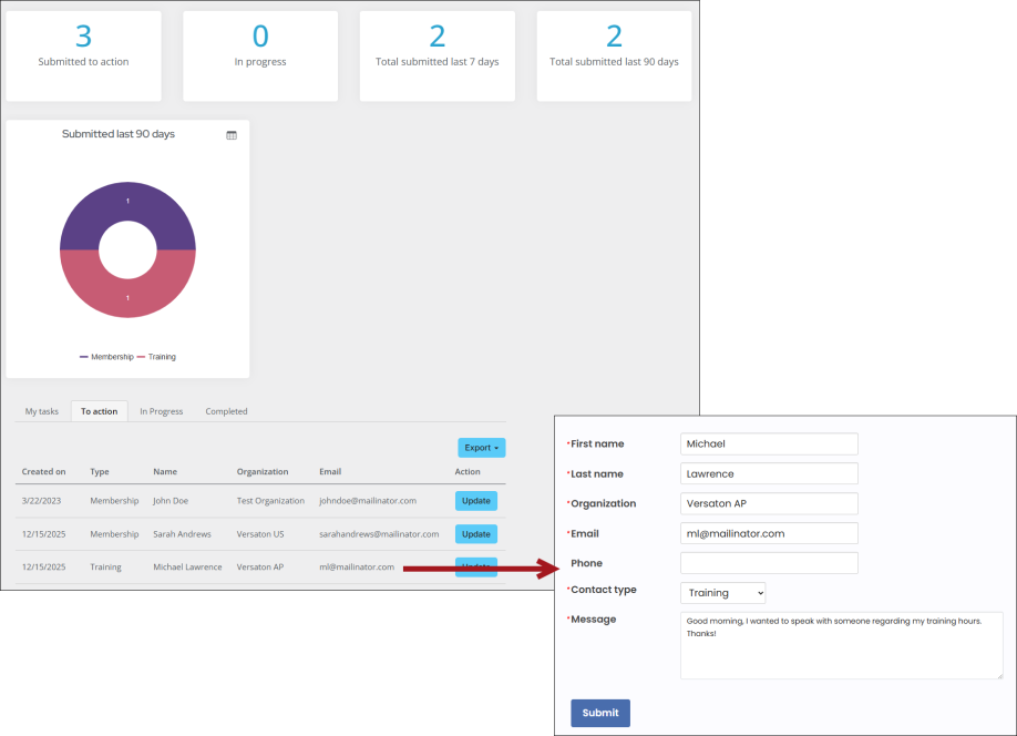 The Contact Us feature allows your members, or the public, to submit inquiries through a form on your website. Inquiries can be assigned for action by team members and their progression tracked by the Contact Us dashboard.