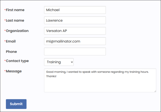 - CONTACTUS_CONTACTTYPE - Define different types of inquiries that the user can choose from a drop-down list on the Web - Contact us form. The standard options are: Membership, Other and Training.