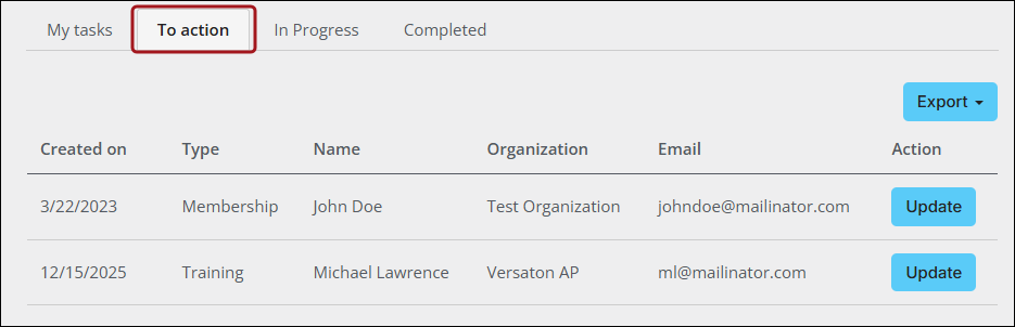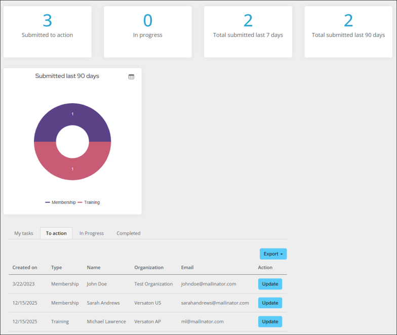 - Submitted to action - Used on the To action tab, displays all inquiries that have been submitted but not yet reviewed.