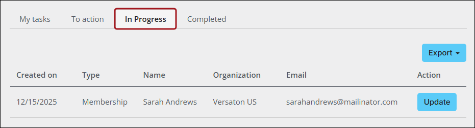 - List - In Progress to action - Used on the In Progress tab of the content collection organizer to display a list of all inquiries with a status of In Progress.