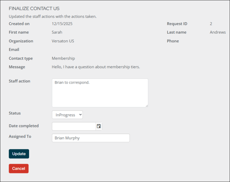 - Staff - Update contact us - The form used by staff to update an inquiry. The following statuses are available: