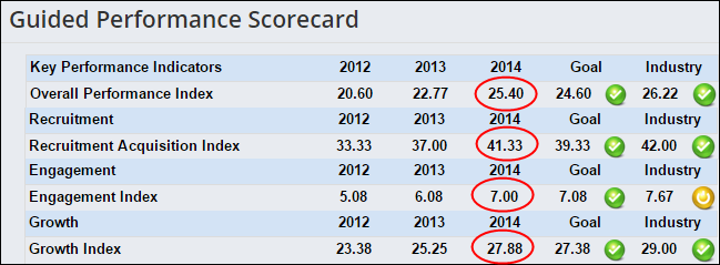 The Goal and Industry values are defined by your organization. Based on these values, the scorecard displays the actual scorecard values for the previous three years to allow your organization to review trends in performance within your organization and against industry standards . The Guided Performance Scorecard provides an easy-to-read layout with colorful icons to indicate the status of Recruitment, Engagement, and Growth performance indicators: