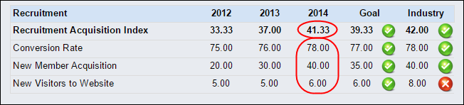 - Recruitment Acquisition Index – The overall Recruitment performance index tracks your organization’s recruitment performance trends based on Conversion Rate, New Member Acquisition rate, and the New Visitors to Website rate for a specified year.