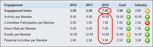 - Engagement Index – The overall Engagement performance index tracks your organization’s engagement performance trends based on Activity per Member, Committee Participation per Member, Direct Mail per Member, Emails per Member, and the Financial Activities per Member rate for a specified year.