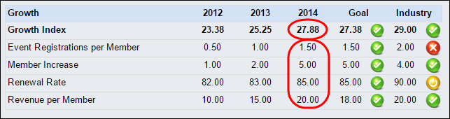 - Growth Index – The overall Growth performance index tracks your organization’s growth trends based on Event Registrations per Member, Member Increase, Renewal Rate, and Revenue per Member rate for a specified year.
